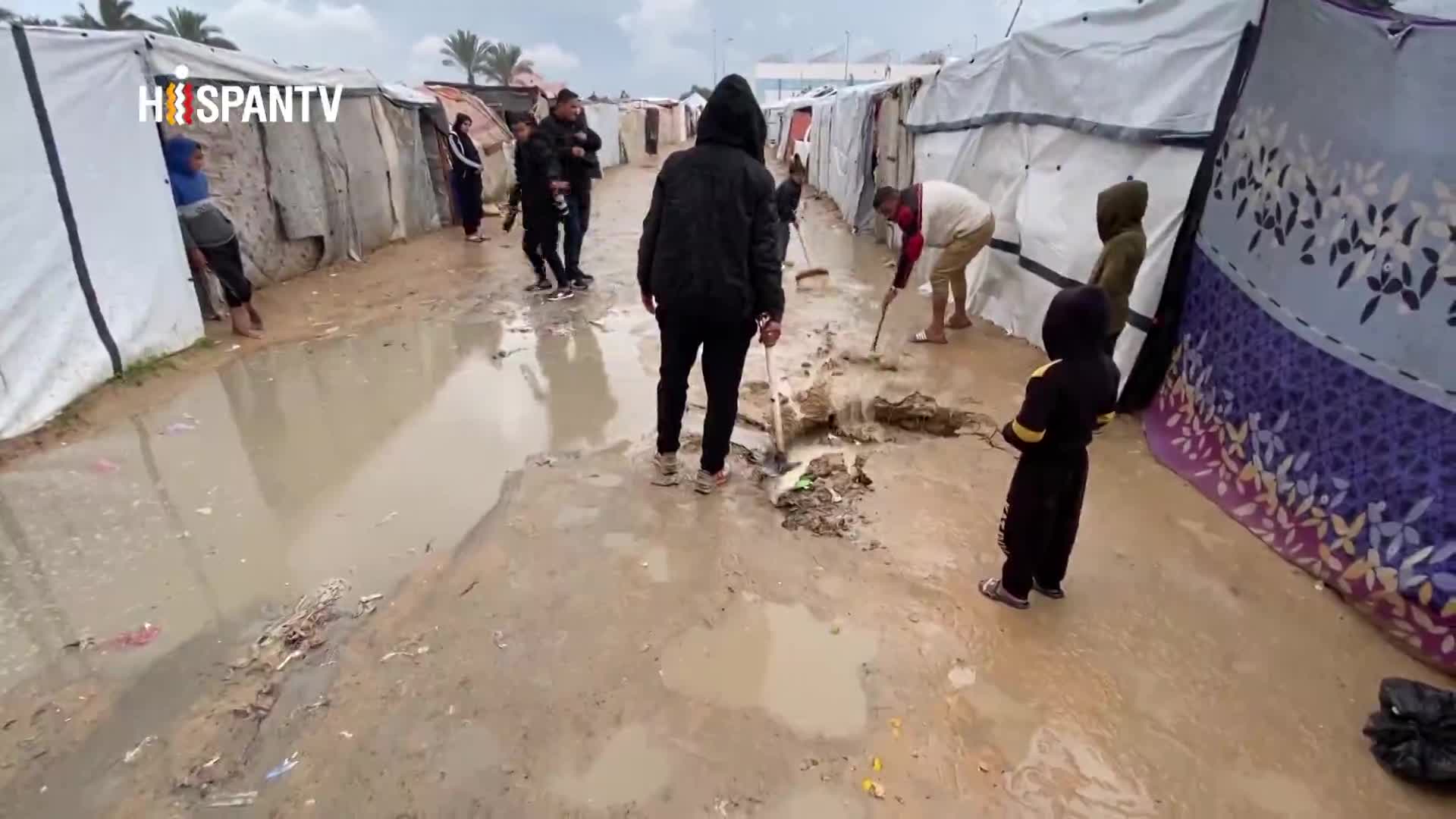 En la Franja de Gaza las fuertes precipitaciones han sumergido bajo el agua a miles de tiendas de campaña y refugios improvisados, dejando a cientos de familias sin un lugar seco donde cobijarse, mientras el intenso frío y la mezcla de agua de lluvia con aguas residuales elevan el riesgo de enfermedades.