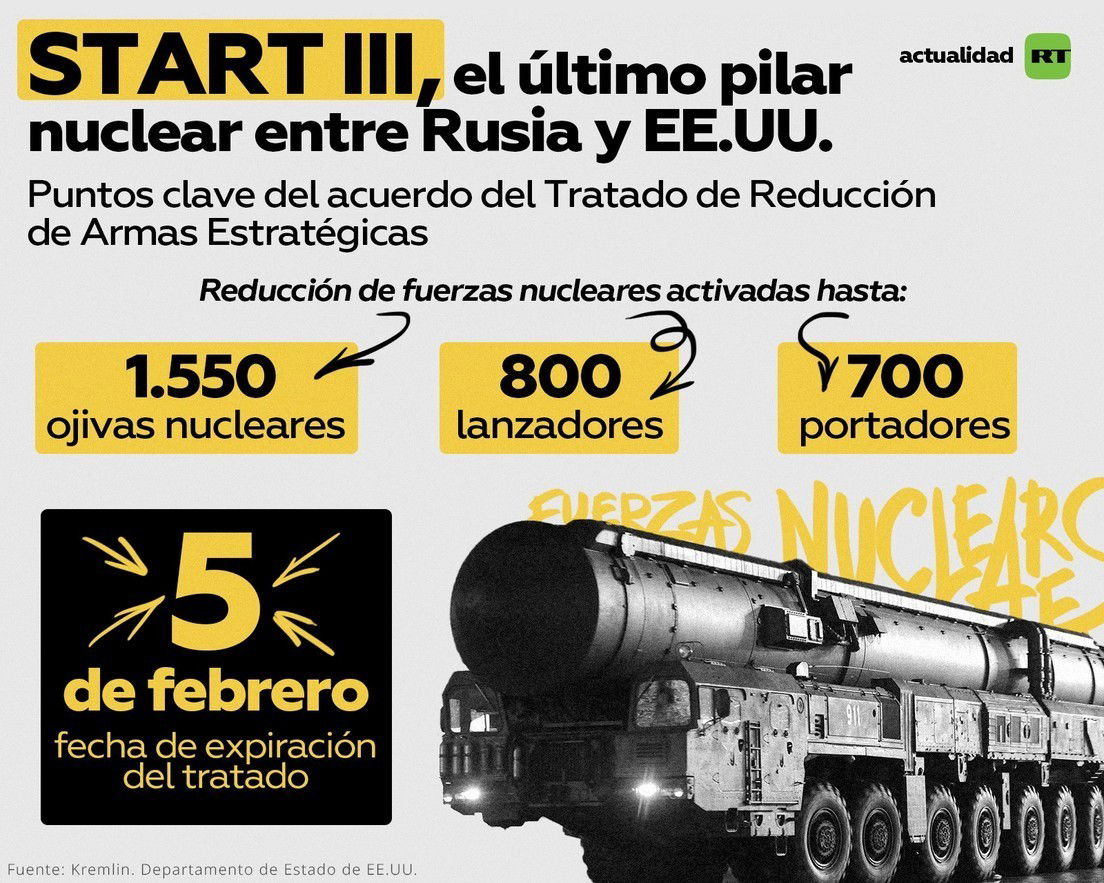 ¿En qué consistía el tratado?El START III, que suponía el último pilar de contención nuclear entre Rusia y EE.UU., expira este 5 de febrero, algo que Moscú lamentó y consideró "negativo". "A partir de ahora, todo dependerá de cómo se desarrollen los acontecimientos", declaró este jueves el portavoz presidencial ruso, Dmitri Peskov.