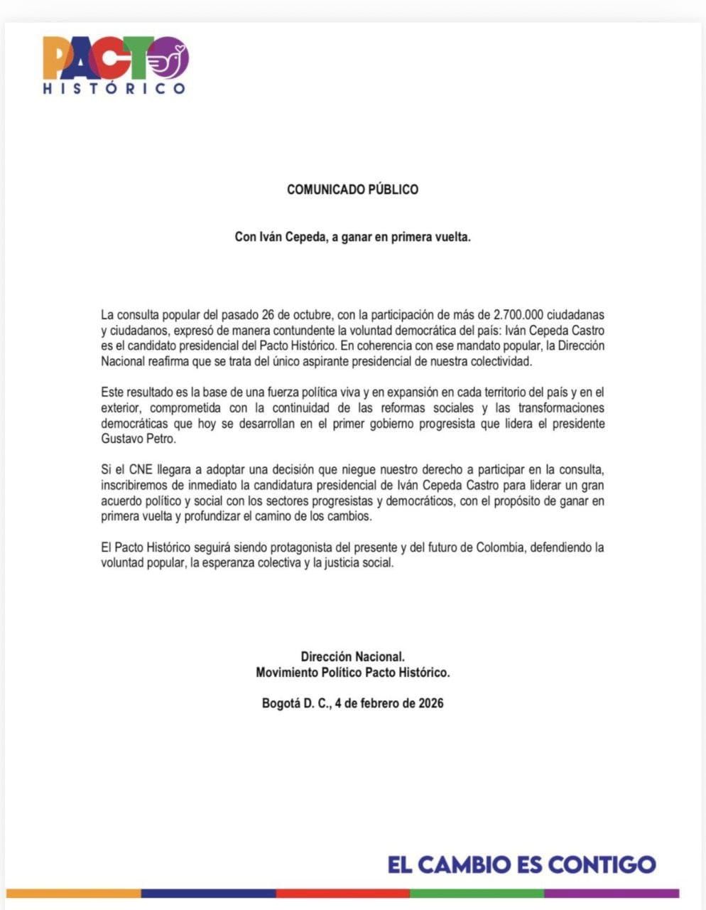 Cepeda reiteró que, tal como adelantó el día anterior, el Pacto Histórico se retira de la consulta del 8 de marzo y él se inscribirá para la primera vuelta presidencial de mayo de 2026.