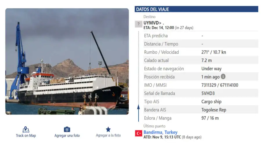 Los registros de tráfico marítimo consultados este lunes indican que el Spiridon II ya abandonó el mar de Mármara y navega rumbo a Montevideo. Lo hace a una velocidad estable de 10 a 11 nudos y con una fecha estimada de llegada para el 14 de diciembre, tras haber partido de Bandırma el 9 de noviembre. El viaje, de más de 10.000 kilómetros, apenas empieza.