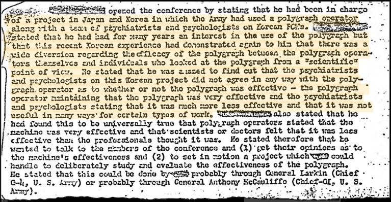 Durante la Guerra de Corea, la CIA desarrolló proyectos en los que participaron operadores de polígrafo, psiquiatras y psicólogos en interrogatorios a prisioneros de guerra norcoreanos. Los documentos también detallan planes para crear equipos entrenados en el uso de fármacos, hipnotismo y polígrafo "con fines de control de la personalidad".