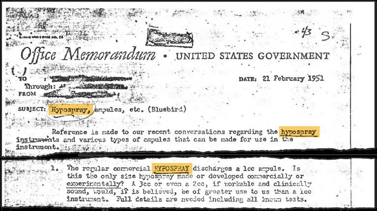 Memorando desclasificado de la CIA de 1951 sobre el Proyecto Bluebird detalla su interés en probar la tecnología 'hipospray" / Captura de pantallaCIA / Archivo de Seguridad Nacional de EE.UU.