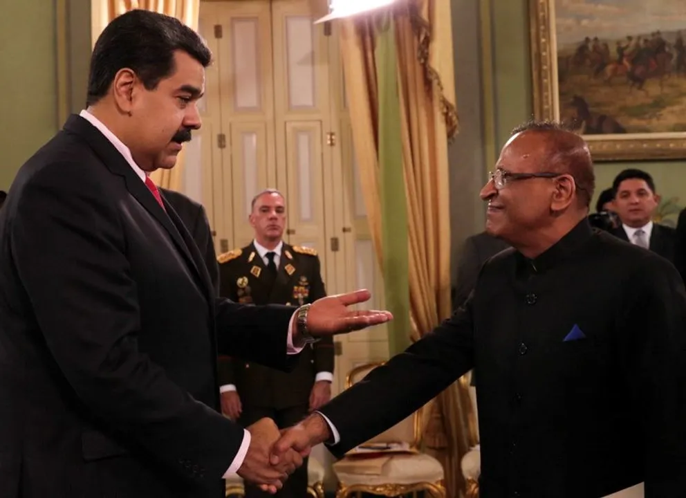 El presidente de Venezuela, Nicolás Maduro, recibe al entonces embajador de India, Rajiv Kumar Nagpal, en el Palacio de Miraflores, en septiembre de 2018.
