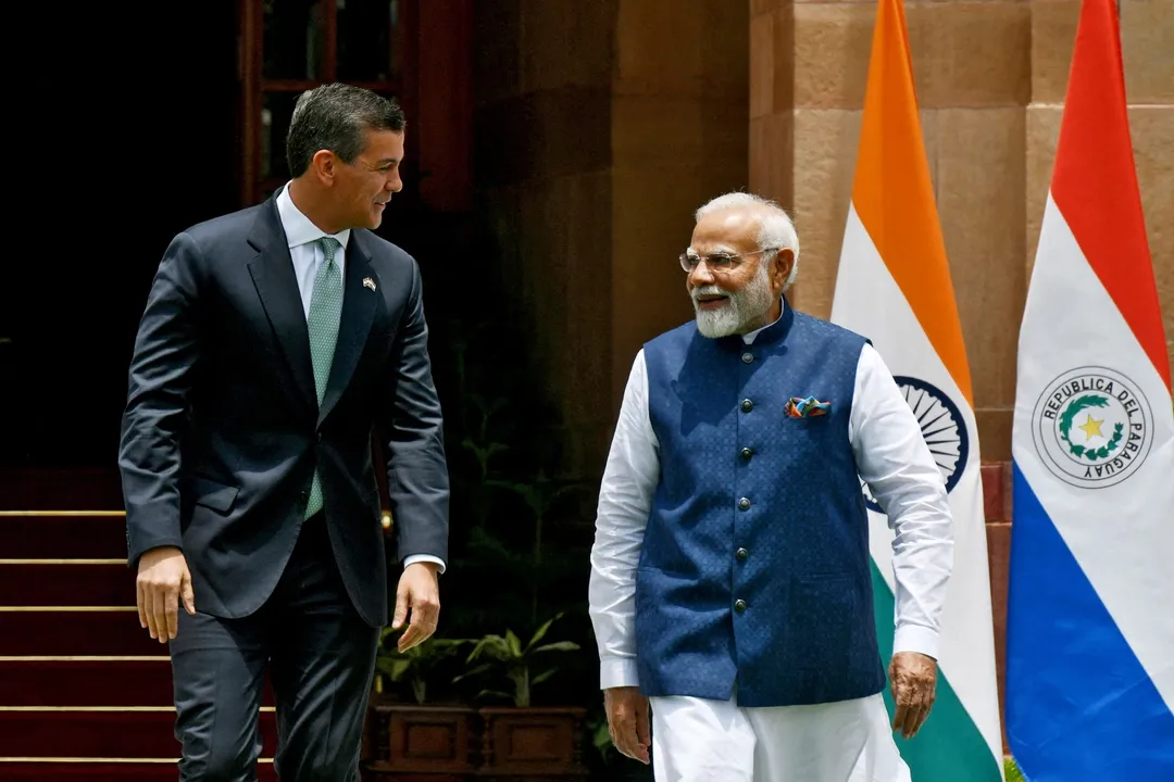 Modi junto al presidente de Paraguay, Santiago Peña, llegan para una foto en Nueva Delhi, en junio de 2025.