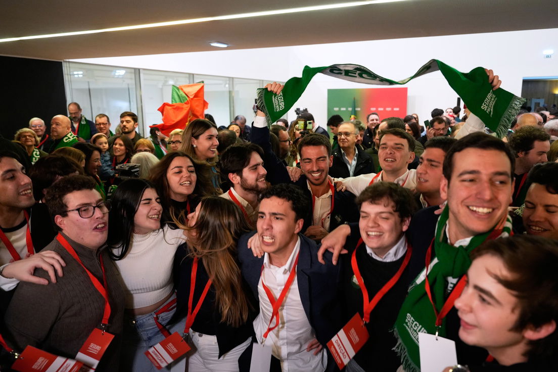 Partidarios del Partido Socialista de centroizquierda reaccionan a los resultados del primer recuento de votos durante las elecciones presidenciales, Lisboa, Portugal, 8 de febrero de 2026.Ana Brigida / AP