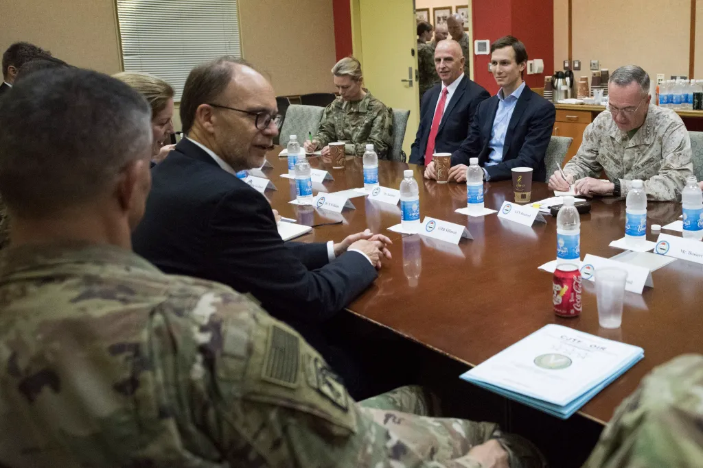 Keith Schiller se sienta a la izquierda de Jared Kushner durante un viaje a Irak en 2017.