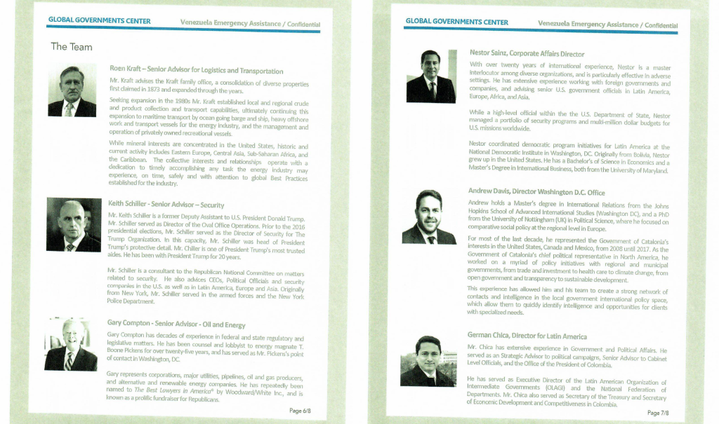 En una entrevista con Max Blumenthal para The Grayzone, Goudreau dijo que el equipo de Global Governments (GG) tenía un grupo de motivos sencillos: “Querían contratos. Querían una forma de monetizar lo que vendría después en una Venezuela libre de Maduro”. Aparte de Schiller, aquellos mencionados en los documentos internos como miembros del “Equipo” incluyen a: