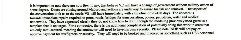 “Por favor tomen en cuenta que el BID no pagaría o aprobaría un pago para beligerantes o seguridad. Necesitarían ser reservados y facturados como algo así como personal de salud, seguridad y medio ambiente (HSE)”, escribió el financista.