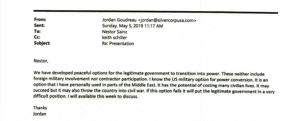 ”El 3 de mayo, Nestor Sainz le pidió a Goudreau que se presentara junto a su compañía de seguridad privada, Silvercorp USA (radicada en Florida), al resto del equipo de GG. En un correo a Sainz y Schiller dos días después, Goudreau adelantó sus presuntas “opciones pacíficas” para el cambio de régimen, que no implicaban ni “involucramiento militar extranjero ni participación de contratistas de seguridad”. Contrastó sus propios planes con la “opción del ejército estadounidense por la conversión del poder”. Pero habiéndolo “usado personalmente en partes del Medio Oriente”, Goudreau reconoció que una intervención del ejército estadounidense en Venezuela “tiene el potencial de costar muchas vidas civiles” y “también pudiera arrojar al país a una guerra civil”.