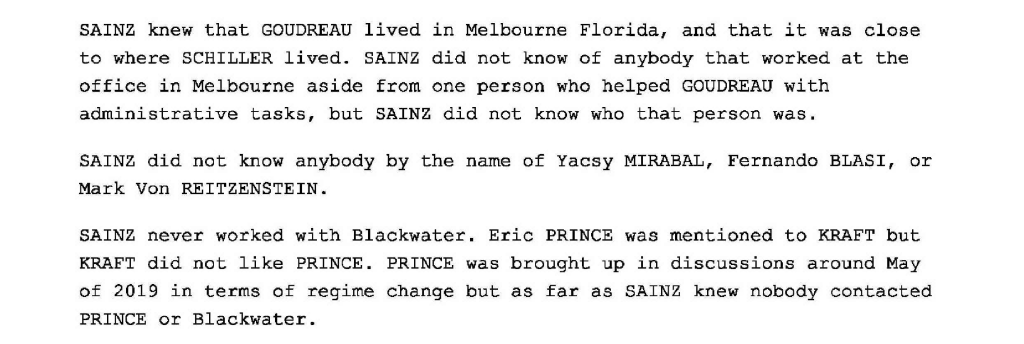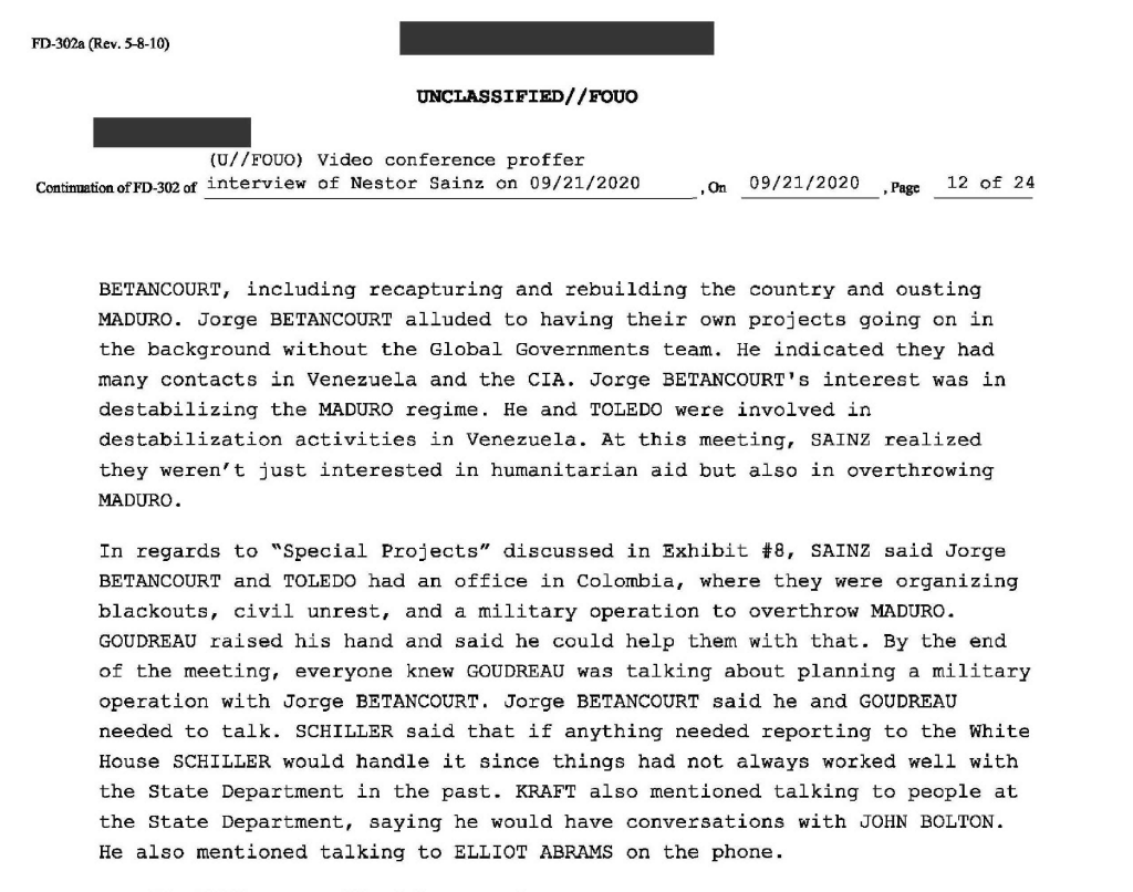 Aunque GG luchó por despegar, Sainz le contó al FBI que estaba claro que la firma estaba preparando una operación de corte militar en Venezuela, una percepción que Goudreau confirma que era ampliamente compartida. “En la primera reunión que tuvimos, todos nosotros junto a GG, siempre supimos que yo iba a dar un golpe militar, dijo Goudreau.