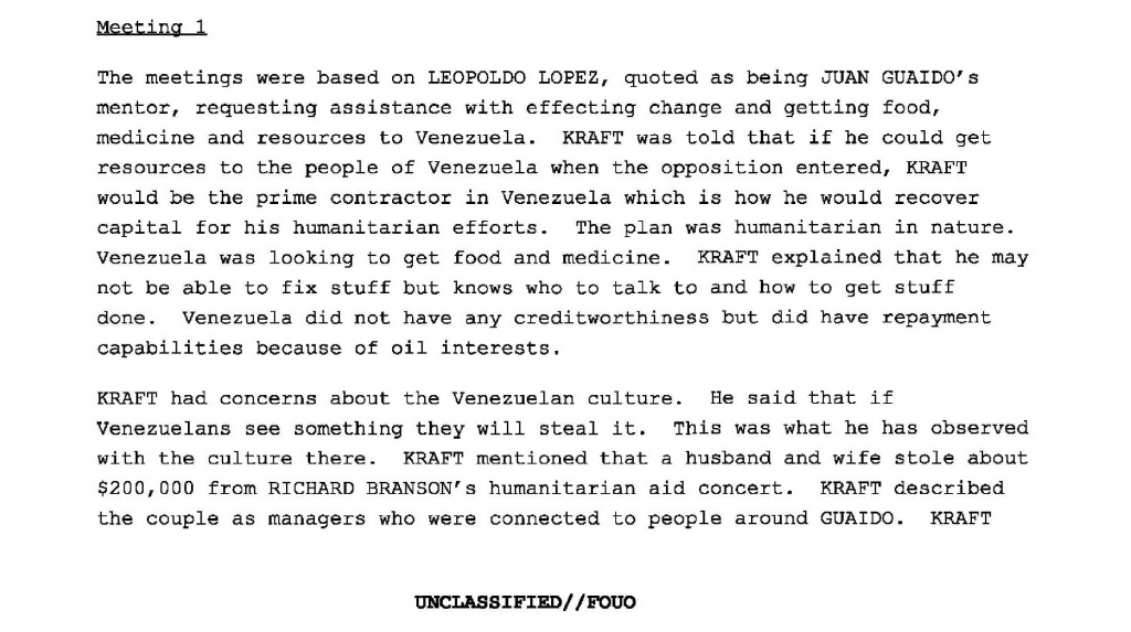 La entrevista del FBI señala que “se le dijo a Kraft que podía conseguir recursos para el pueblo de Venezuela cuando entrase la oposición, Kraft sería el principal contratista en Venezuela”. Pero de haber ido al país para extraer riquezas, él sería el primero en lidiar con los tahúres locales que daban su línea directa para el posible gobernante de la Venezuela post-Maduro. Desde el principio, escribió el FBI, “Kraft tenía preocupaciones sobre la cultura venezolana”; específicamente, “dijo que si los venezolanos ven algo se lo roban”.