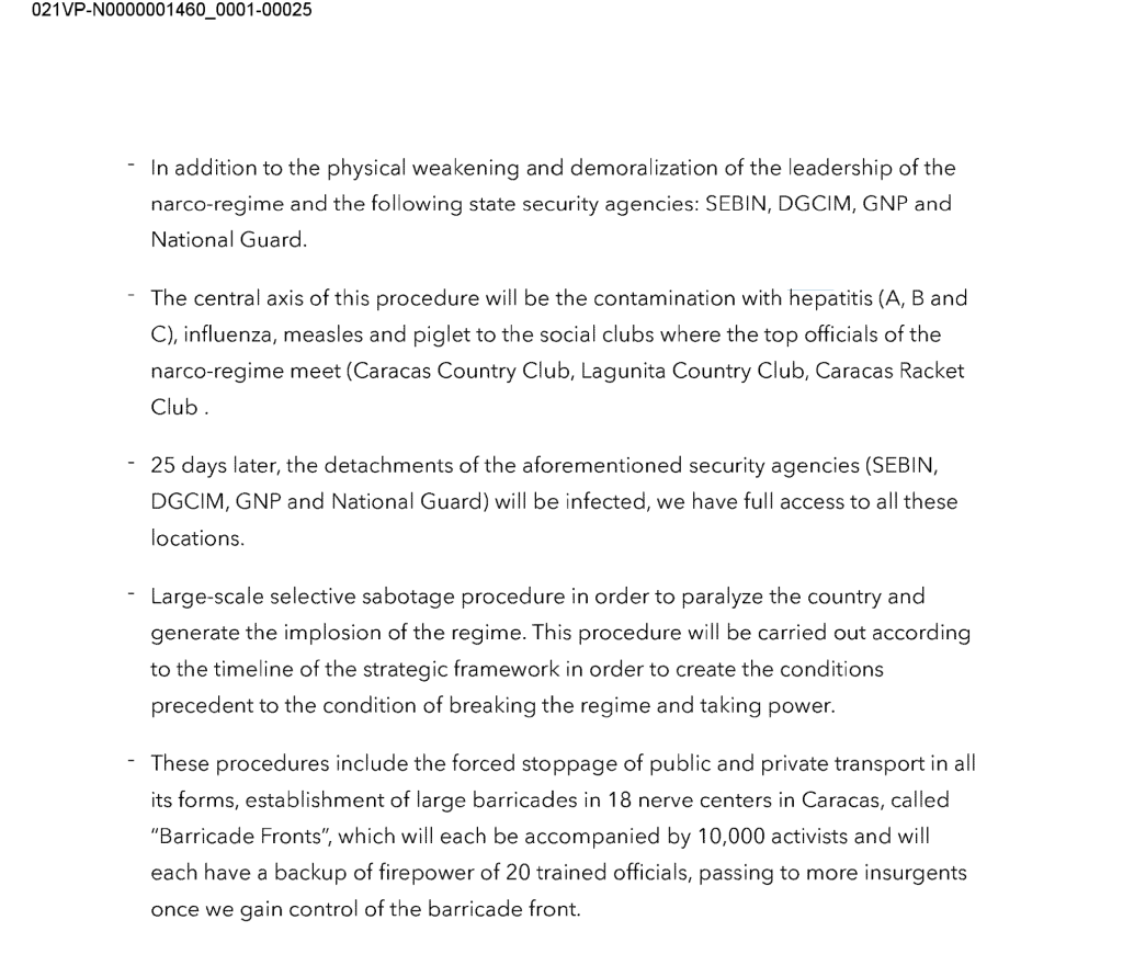 El encabezado del documento demuestra que la exposición de venta fue dirigida directamente a Pence. Escrito en un inglés no-nativo y repleto de errores gramaticales, el documento contenía una colección de propuestas de ataques terroristas en toda Venezuela, incluyendo operaciones de bandera falsa, esparcir “hepatitis (A, B y C), influenza, sarampión” en los lockers de los country club de Caracas frecuentados por funcionarios del gobierno, así como financiar una insurgencia al expropiar “sustancias narcóticas”.