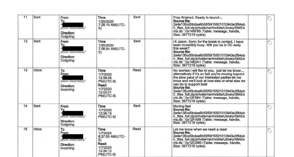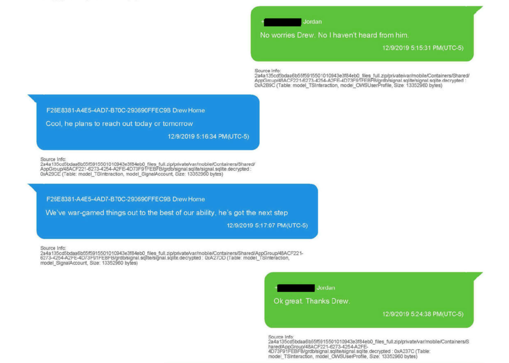 Registros de mensajes de texto demuestran que Horn contactó a Goudreau por Signal el 9 de diciembre de 2019 para informarle que Beardsley había desarrollado aún más el esquema. “Hemos pasado todo por juegos de guerra de la mejor manera posible, Jason tiene los próximos pasos” se lee en el texto de Horn.