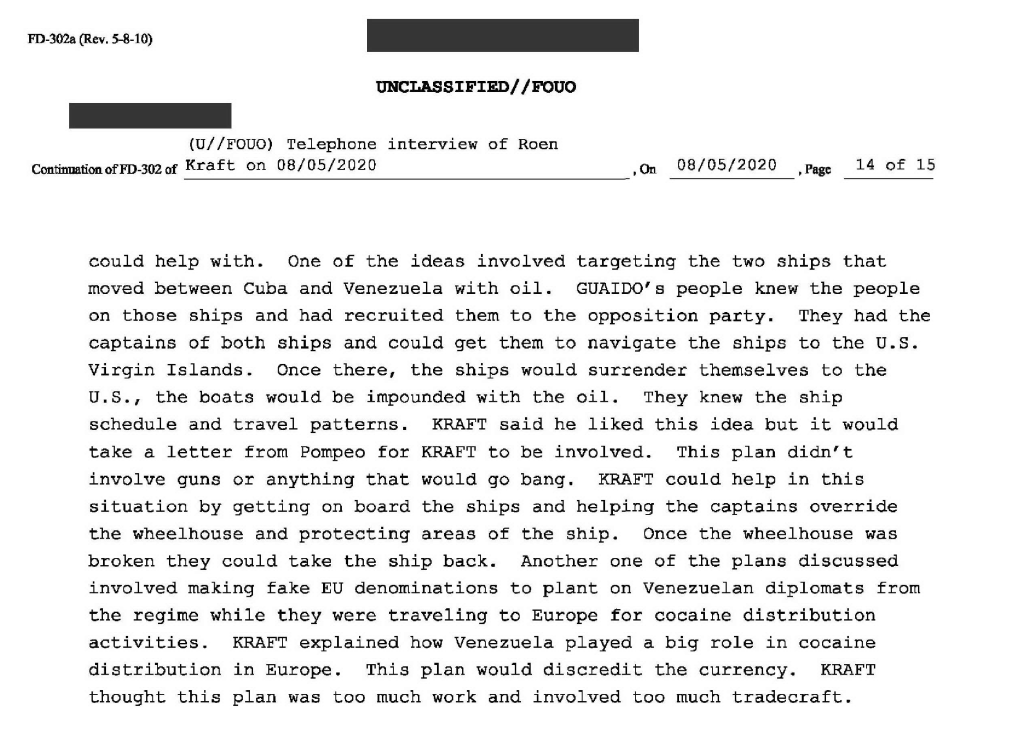 Kraft le dijo al FBI que Omaña y “Carlos” buscaron contactarlo por varios acuerdos de negocios, y le solicitaron su apoyo para una serie de tramas engañosas contra el gobierno venezolano. La primera involucraba tomar un par de cargueros que transferían petróleo de Venezuela a Cuba. Los operadores de Guaidó estaban confiados de que podían incautar los barcos a través de la miembros de la tripulación que habían sido reclutados, y que serían capaces de dirigirlos a las Islas Vírgenes estadounidenses y entregárselos a las autoridades de los Estados Unidos.
