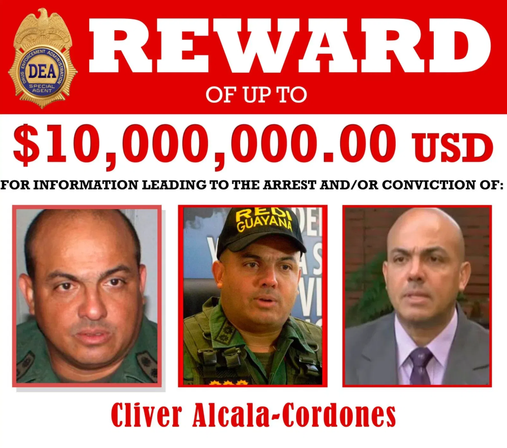 La Administración de Control de Drogas de Estados Unidos publicó un cartel de búsqueda de Clíver Alcalá Cordones el 26 de marzo de 2020.