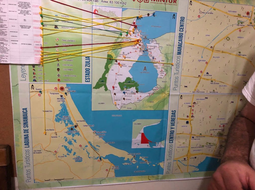 Una foto tomada el 16 de junio de 2019 muestra mapas que identifican objetivos militares de la Operación Gedeón, expuestos en la sede colombiana del grupo. (Foto cortesía de Jordan Goudreau)