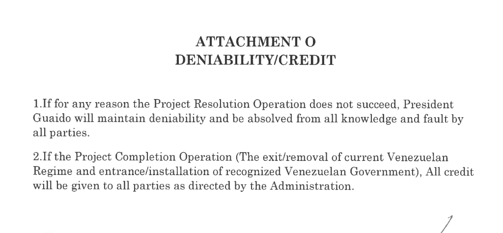 Pero no anticipó que pudiera procesarlo, forzándolo a quitar el manto de secrecía que había construido alrededor de la Operación Gedeón.La posibilidad de negarlo fue explícitamente incorporada al contrato de Goudreau con Rendón. El acuerdo manifestaba que Guaidó podía “mantener la denegabilidad y ser absuelto de todo conocimiento y culpa de todas las partes” por la operación. Y en efecto, Guaidó lo ha hecho.