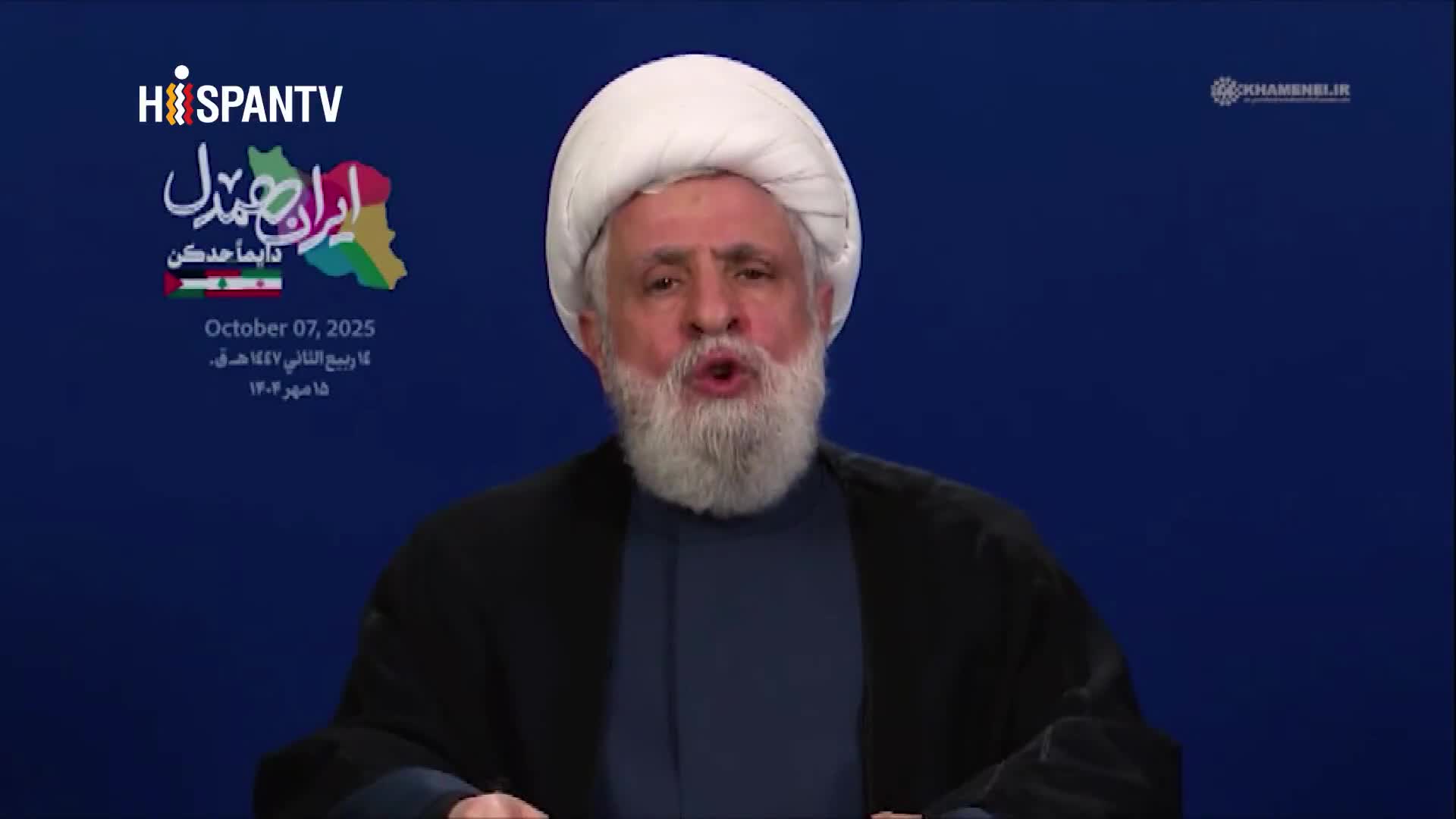 - Remarcó que la hostilidad del Occidente contra Irán no tendrá resultado. “Han vuelto a imponer sanciones contra Irán, pero ¿acaso estas sanciones se han levantado alguna vez? Las sanciones han estado vigentes durante 46 años desde la victoria de la bendita Revolución Islámica hasta ahora, pero la nación iraní brilla día tras día frente al enemigo, demostrando que es un pueblo de lucha y de verdad”, resaltó.El sheij Qasem también conmemoró el legado de los dos líderes mártires de Hezbolá, Seyed Hasan Nasralá y Seyed Hashem Safi al-Din. Señaló que la Resistencia ha salido fortalecida de una batalla difícil y compleja que no había enfrentado en más de 40 años.