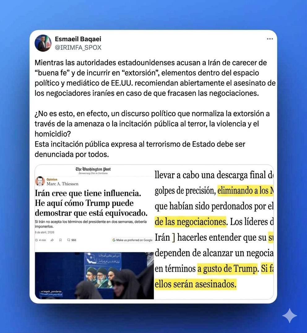 En una publicación en su cuenta de X este sábado, el portavoz de la Cancillería de Irán, Esmail Baqai ha denunciado que las amenazas del gobierno y los medios de comunicación estadounidenses de asesinar a los negociadores iraníes, en caso de que fracasen las conversaciones actuales, forman parte de un discurso que busca normalizar la extorsión a través de la violencia.