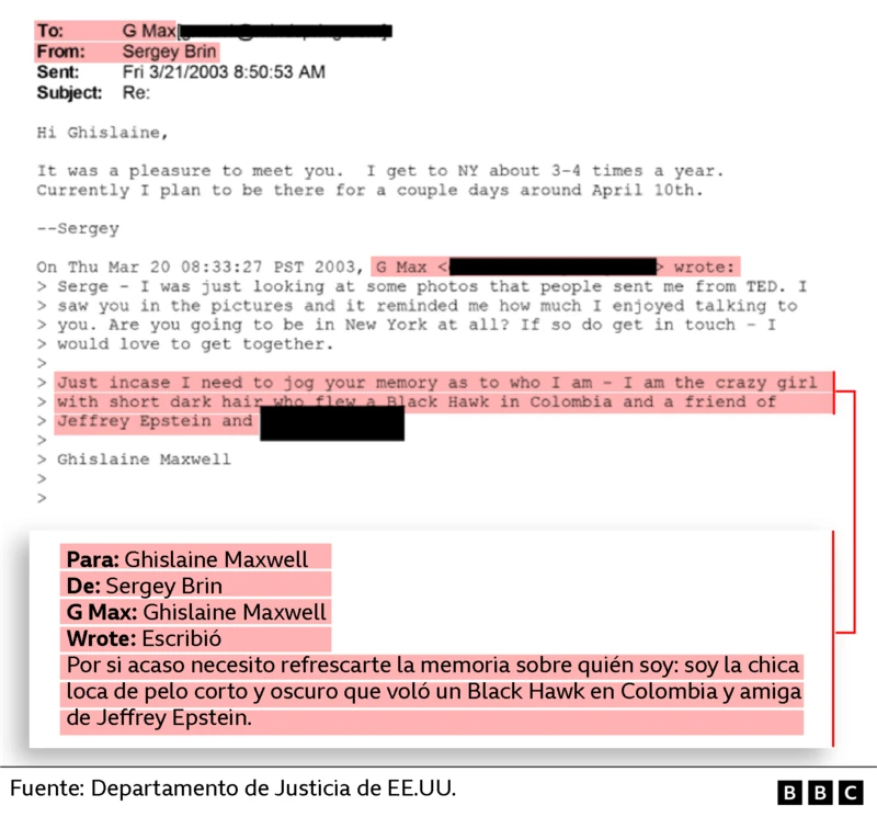 Sobre ese }}episodio del helicóptero hay, además de las dos fotos, dos correos electrónicos en los archivos de Epstein.Uno, enviado por Maxwell en marzo de 2003 al cofundador de Google, Sergey Brin, dice: