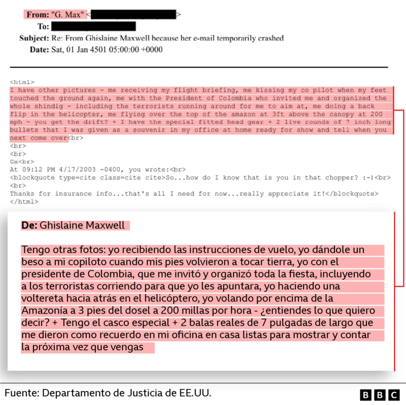 En su entrevista con el fiscal general adjunto de EE.UU., Todd Blanche, en 2025, Maxwell mencionó una vez más la visita a Colombia y el vuelo en helicóptero: