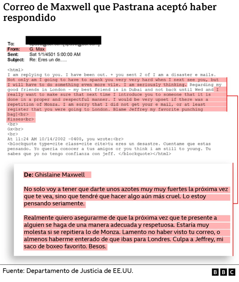 La siguiente interacción que consta en los documentos del DoJ entre Maxwell y Pastrana ocurrió unos meses después, cuando él ya había dejado de ser presidente.Pastrana le escribe en un correo electrónico a Maxwell el 14 de octubre de 2002: