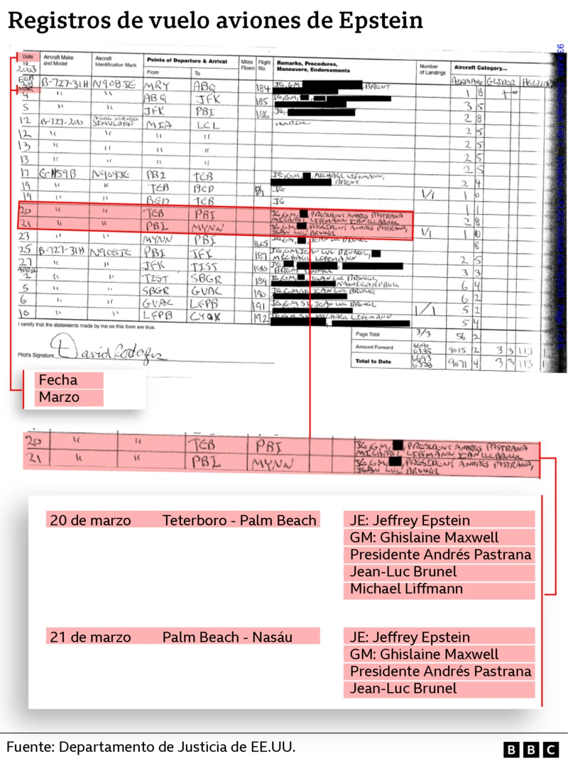 Según consta en los registros de vuelo publicados por el DoJ, el expresidente Pastrana se subió en un avión privado con Epstein en dos ocasiones, el 20 y 21 de marzo de 2003.