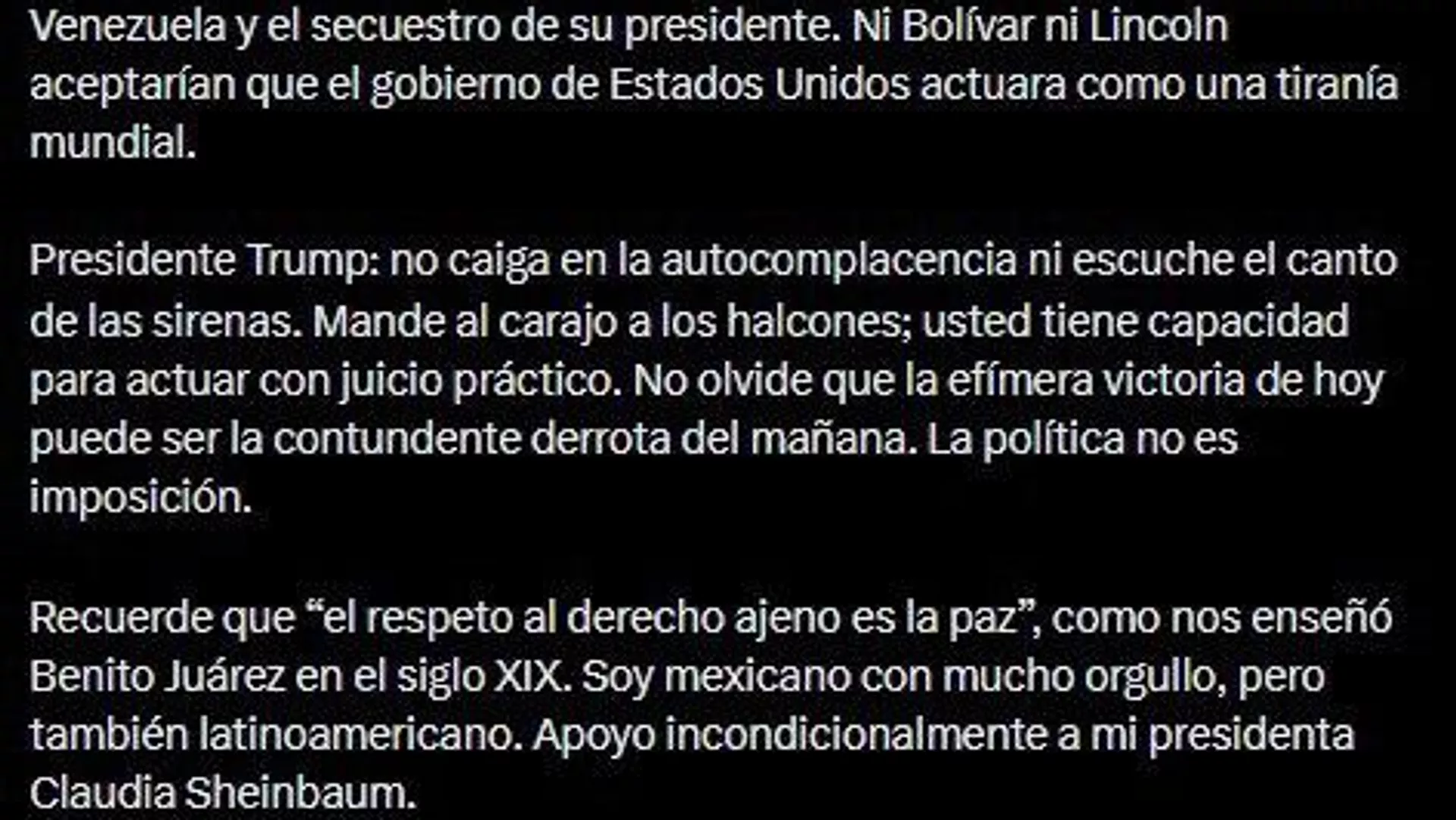 "Soy mexicano con mucho orgullo, pero también latinoamericano. Apoyo incondicionalmente a mi presidenta Claudia Sheinbaum", añadió, en referencia a los dichos de Trump quien, tras ordenar el ataque contra Venezuela, comentó a la prensa que "algo se tiene que hacer con México", en referencia a los cárteles del narcotráfico.