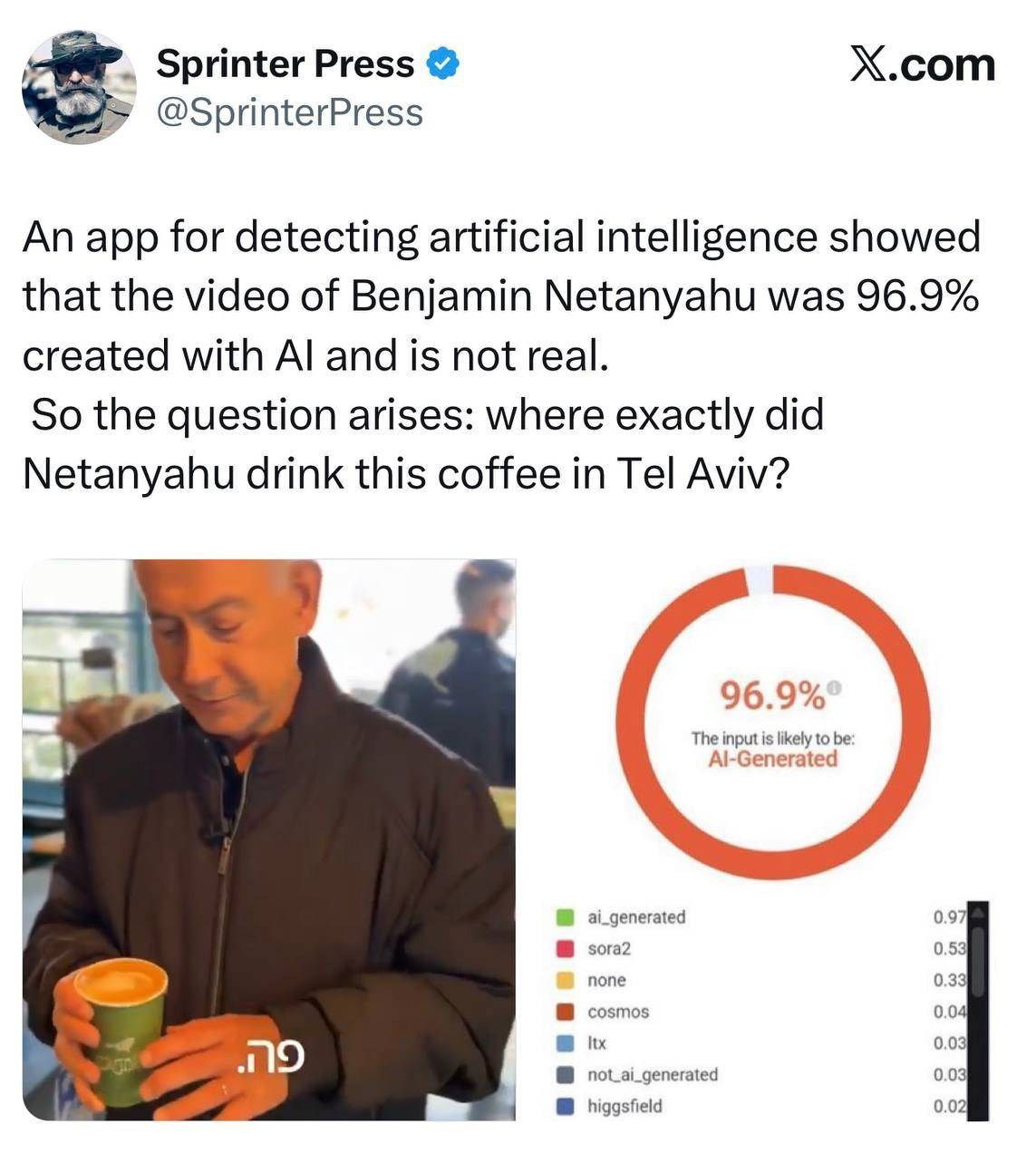 Una clara señal de que el último vídeo ha sido generado por inteligencia artificial es que la taza de café está llena hasta el borde, pero no se derrama ni una sola gota mientras la taza se inclina o se mueve rápidamente, ni se reduce el café mientras Netanyahu lo bebe.
