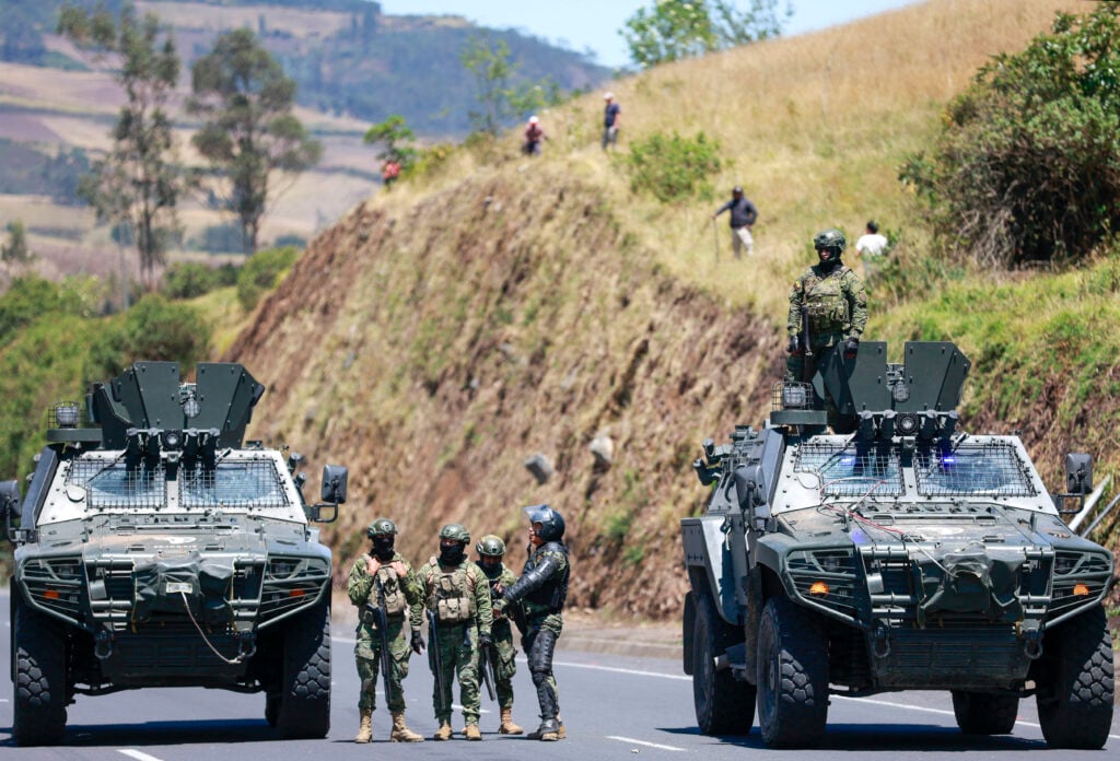 22 septiembre, 2025 (Xinhua): Elementos del Ejército de Ecuador vigilan un bloqueo realizado por indígenas durante el paro nacional indefinido en rechazo a la reciente eliminación del subsidio al diésel, en la provincia de Imbabura.