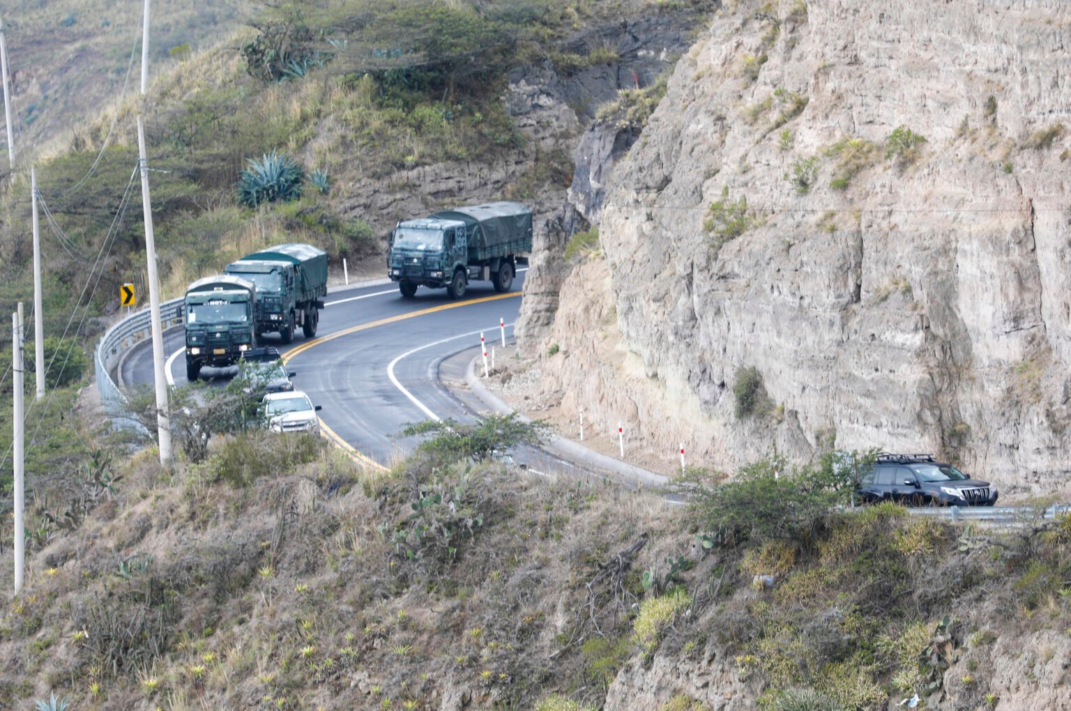 13 octubre, 2025 (Xinhua): vehículos militares avanzan por una carretera como parte del operativo de escolta del convoy humanitario hacia Imbabura.