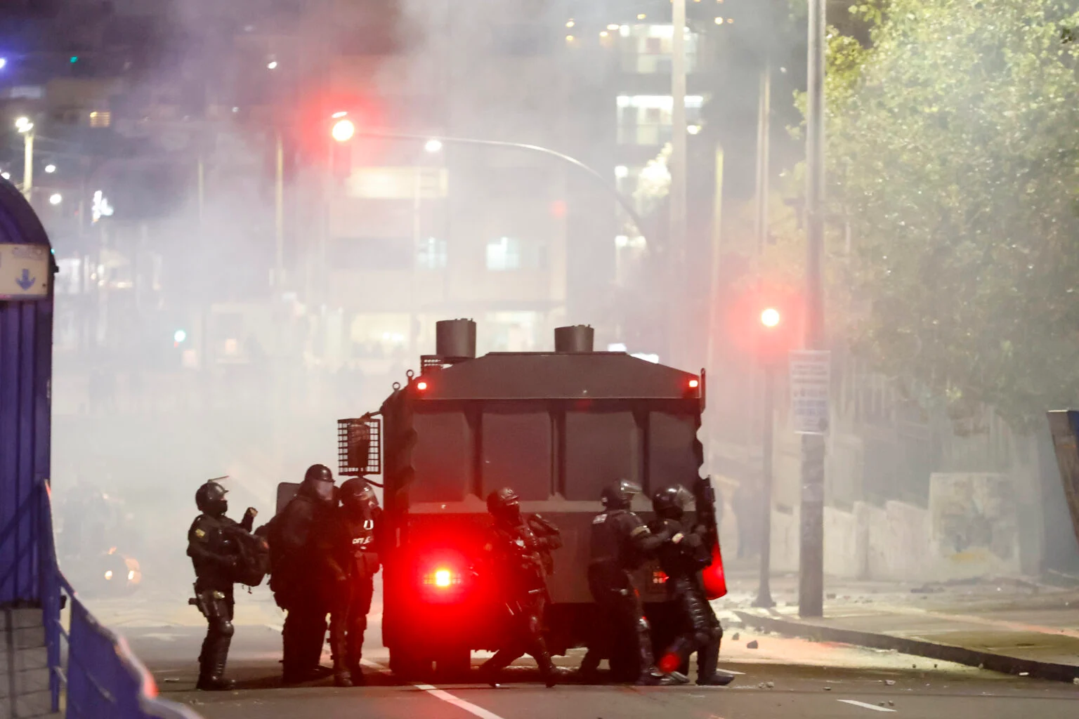 15 octubre, 2025 (Xinhua): Policías reprimen a estudiantes durante una protesta en el marco del paro nacional, en Quito.