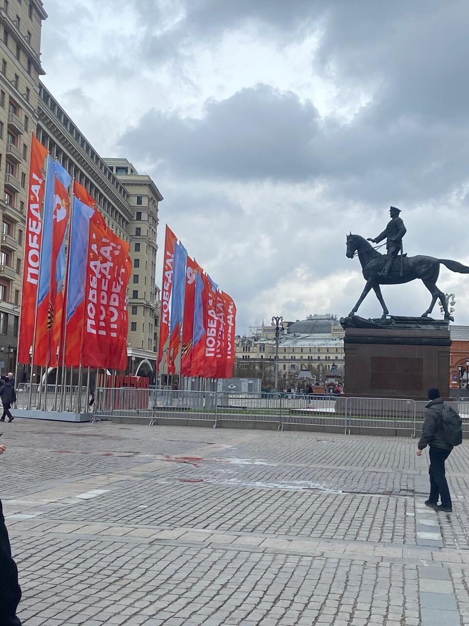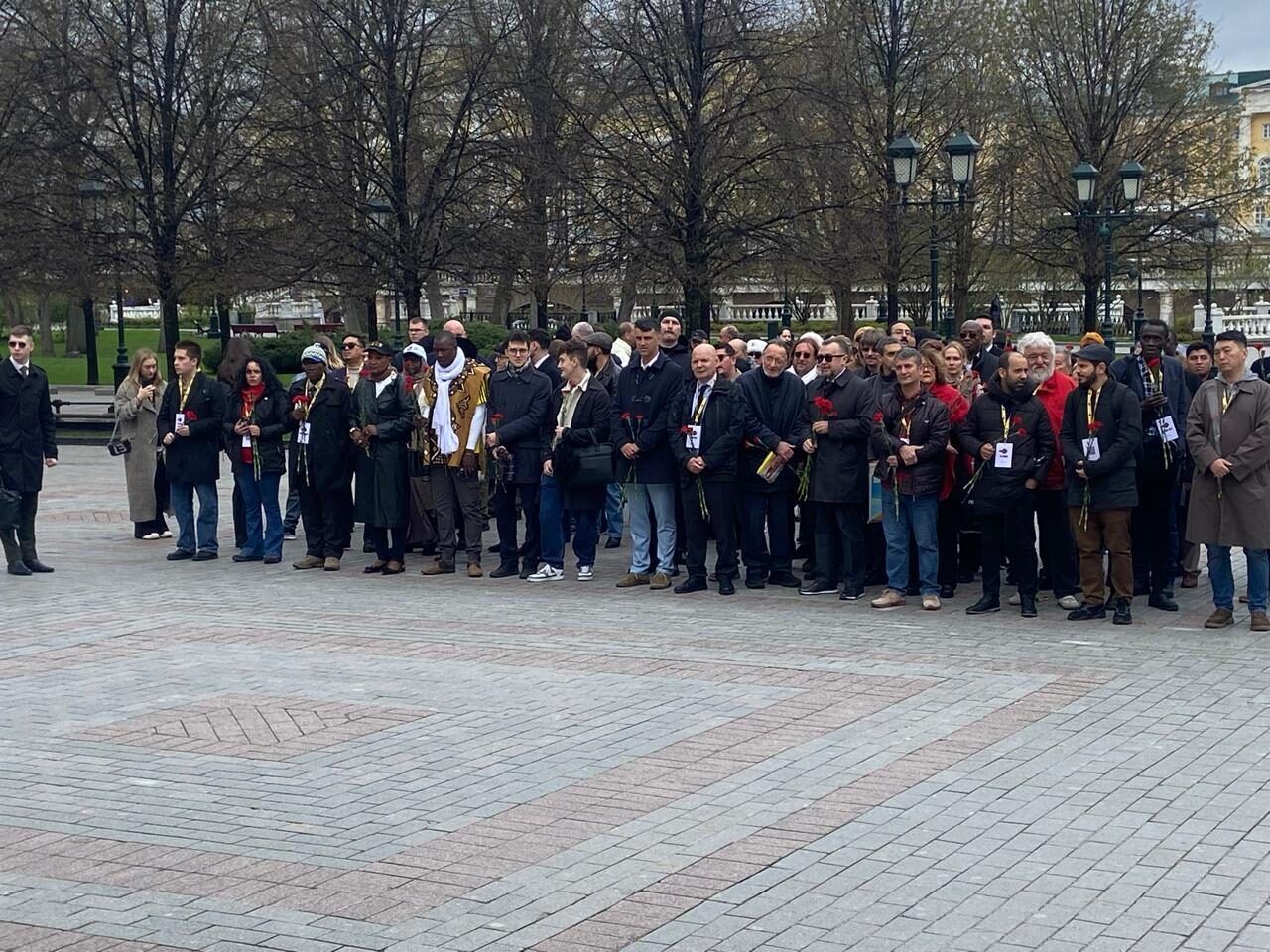 Durante la mañana los participantes concurrieron a la Plaza Roja a depositar claveles rojos frente a la llama eterna de la Tumba del soldado desconocido. La ceremonia rodeada de toda solemnidad mostró el respeto y la admiración de los pueblos del mundo ante la gran hazaña realizada por la URSS de vencer a los invasores nazis y derrotarlos. Precisamente, la Plaza estaba esta vez engalanada con banderas rojas y estructuras gigantescas donde brillaba por todo lo alto la estrella con el martillo y la hoz de los comunistas de todos los continentes. Y esto es así, porque el próximo 9 de mayo ha de celebrarse en ese mismo recinto un gran desfile militar de homenaje al Día de la Victoria contra el hitlerismo, ocurrido en la misma fecha de 1945.